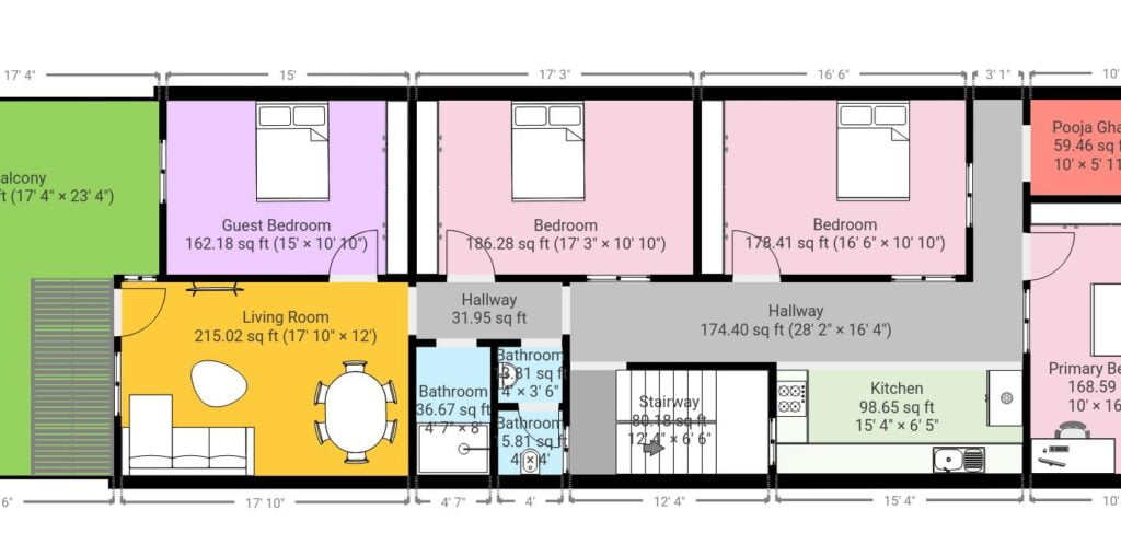 Each room’s dimensions are clearly mentioned, ensuring enough space for furniture and movement.